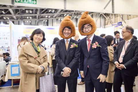 용호성(왼쪽 두번째) 문화체육관광부 제1차관과 윤철호 출협 회장(왼쪽 세번째)이 산지니 부스에서 똥 모양 탈을 쓰고 웃고 있다. 부산국제아동도서전 제공