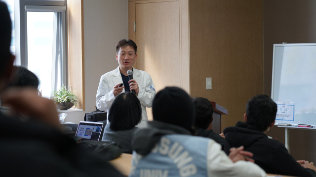 지난달 26일과 27일 부산 부산진구 이샘병원에서 열린 '2024 재부 외국인 유학생 건강축제'에서 윤동영 이샘병원 건강검진센터장이 '수명 연장과 종합건강검진'을 주제로 강의를 하고 있다. 부산권의료산업협의회 제공