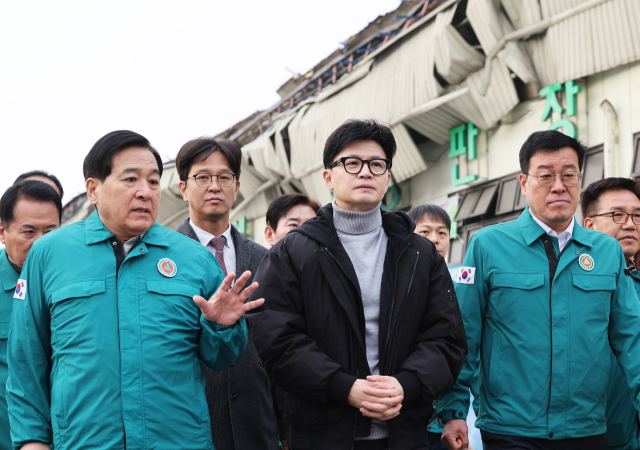 국민의힘 한동훈 대표가 1일 오후 지난 폭설 때 지붕이 무너진 경기도 안양시 동안구 안양농수산물도매시장을 방문해 현장을 살펴보고 있다. 연합뉴스