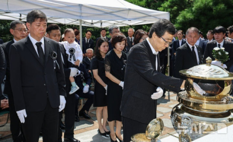 고(故) 김대중 전 대통령의 아들 홍업 씨(오른쪽)와 홍걸 씨가 지난 8월 18일 국립서울현충원에서 열린 김대중 전 대통령 15주기 추도식에서 참배하고 있다.