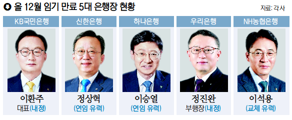 정상혁 신한은행장은 연임 임기가 1년인지 2년인지를 두고 전망이 엇갈리지만 연임 자체는 무난하다는 관측이 많다. 이승열 하나은행장 역시 호실적을 거둔 만큼 연임에 무게가 실리지만, 변화의 가능성도 있다는 분석도 나온다. 반면 이석용 농협은행장의 경우 교체가 유력해 보인다. 올해 초 취임한 강호동 농협중앙회 회장이 중대 사고를 낸 계열사 대표의 연임을 제한하겠다며 직접 겨냥한 바 있기 때문이다.