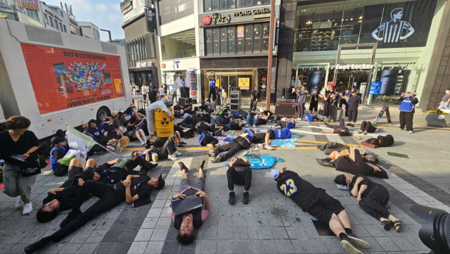 지난 9월 부산 광복로 일대에서 열린 ‘907부산기후정의행진’의 퍼포먼스 장면. 정의롭고 슬기롭게 위기를 극복해 나가자는 여론이 전세계적으로 거세지고 있다. 부산일보DB