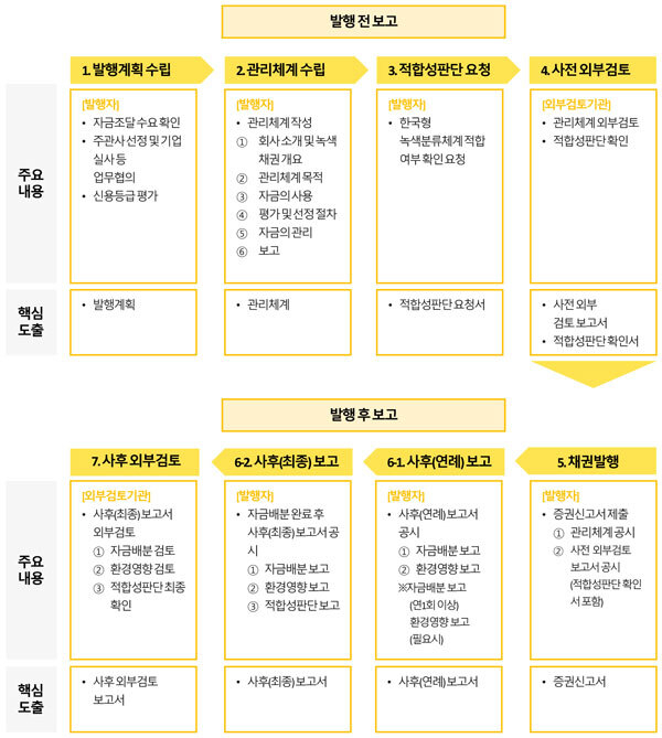대신 외부검토를 통해 녹색채권은 신뢰성을 높인다. 제3자로부터 사전·사후 검토를 받아야 한국거래소에 상장이 가능하다. 채권 관련 전반이 검토 대상이며, 자금 집행 완료 때까지 1년 단위로 사후 보고서도 내야 한다.공