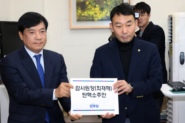 더불어민주당 김용민 원내정책수석부대표와 이성윤 의원이 지난 2일 오후 서울 여의도 국회 의안과에 최재해 감사원장 탄핵소추안을 제출하고 있다. 연합뉴스