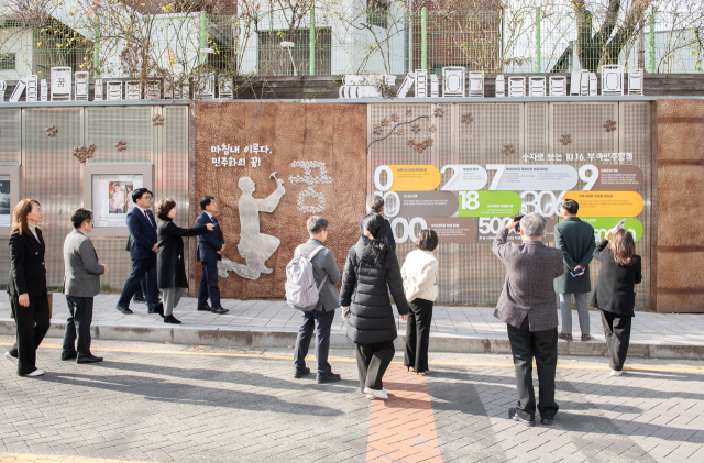 3일 금정구에 따르면 구청 측은 지난달 29일 10·16 부마민주항쟁 명예 거리 조성을 마무리하고 상징물 제막식과 현장 참관식을 열었다. 대한민국 현대사의 4대 민주화 운동 중 하나로 평가받는 10·16 부마민주항쟁의 의미를 젊은 세대들에게 생생하게 전달한다는 의미를 담았다.