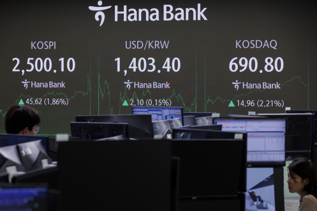 3일 오후 서울 중구 하나은행 본점 딜링룸 전광판에 이날 거래를 마감한 코스피, 코스닥지수와 원/달러 거래가가 표시돼 있다. 연합뉴스