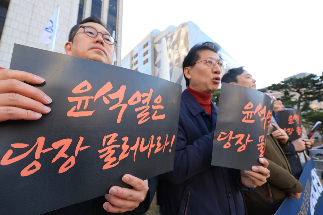 전국언론노동조합, 한국기자협회, 한국사진기자협회 등 언론협업단체 소속 언론인들이 4일 오전 한국프레스센터 앞마당에 설치된 언론자유 상징 조형물 ‘굽히지 않는 펜’ 앞에서 윤석열 대통령의 계엄선포는 헌법 위반이라며 윤 대통령 퇴진을 촉구하고 있다. 연합뉴스