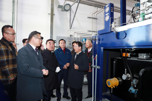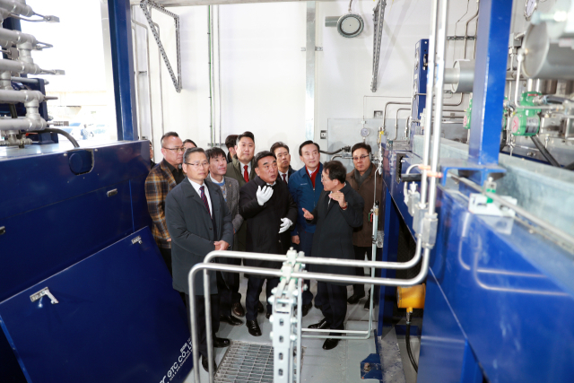 김두겸 울산시장과 김영곤 버스운송조합 이사장 등이 4일 북구 명촌공영차고지 조성공사 준공식에 참석해 수소·전기 충전시설을 시찰하고 있다. 울산시 제공