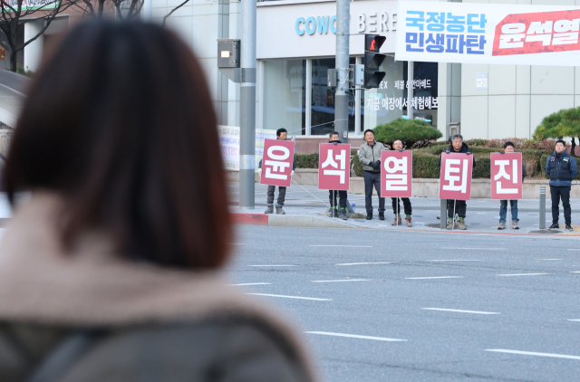 대전 일부 시민사회단체와 정당 등이 연합한 윤석열정권퇴진대전운동본부(운동본부)가 4일 오전 8시부터 대전 서구 둔산동 은하수네거리에서 윤석열 정권 퇴진을 촉구하는 집회를 열고 있다. 연합뉴스