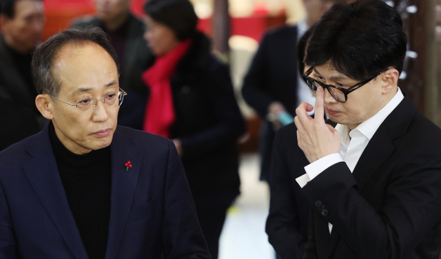 국민의힘 한동훈 대표와 추경호 원내대표가 4일 국회 비상의원총회를 마치고 취재진의 질문을 받고 있다. 연합뉴스