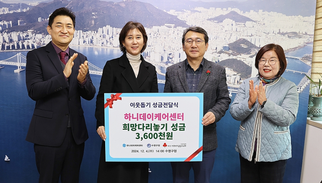 하니데이케어센터(이사장 박성아)는 지난 4일 부산 수영구(구청장 강성태)에 저소득 취약계층을 위한 성금 360만 원을 기탁했다.