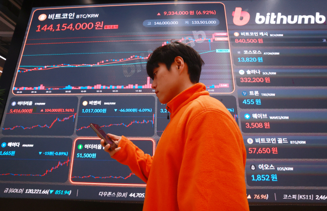 비트코인 가격이 사상 최초로 10만 달러 선을 돌파한 5일 오후 서울 서초구 빗썸라운지 강남점에 비트코인 가격이 표시돼 있다. 연합뉴스