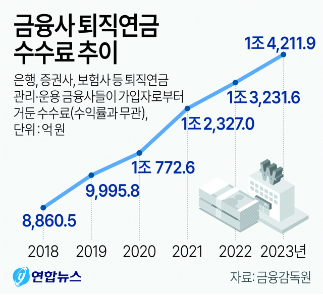 2018년 8860억 4800만 원 규모였던 퇴직연금 수수료 수입은 2020년 1조 원을 넘었고, 2022년 1조 3231억 6100만 원, 2023년 1조 4211억 8600만 원 등 꾸준히 증가하는 추세다.