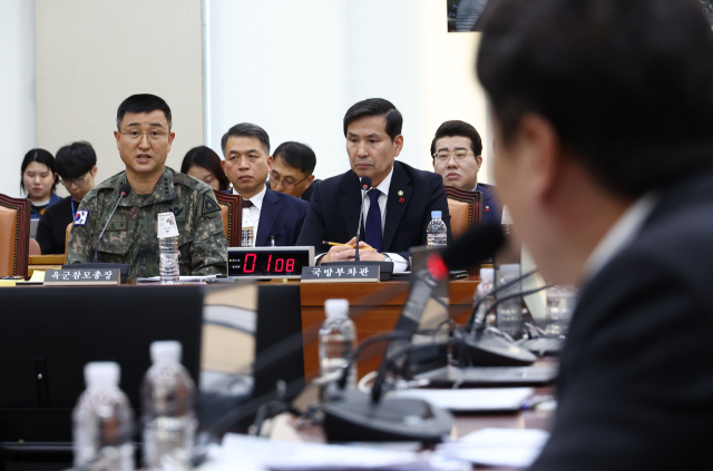 5일 국회에서 열린 국방위원회 전체회의에 지난 3일 비상계엄 때 계엄사령관을 맡았던 박안수(왼쪽) 육군참모총장이 출석해 질문에 답변하고 있다. 연합뉴스