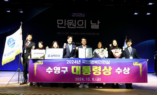 부산 수영구(구청장 강성태)는 지난 6일 행정안전부가 주관한 ‘2024년도 전국 국민행복민원실’ 평가에서 최우수기관으로 선정돼 대통령상을 수상했다.