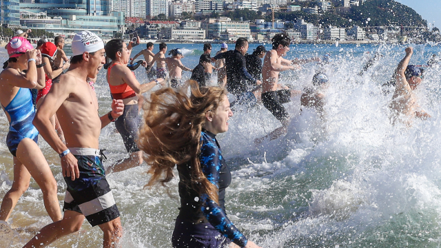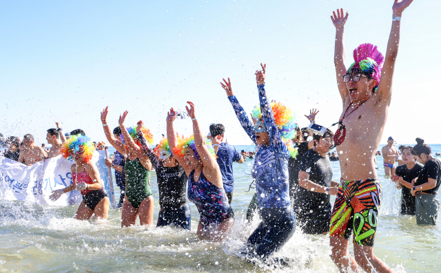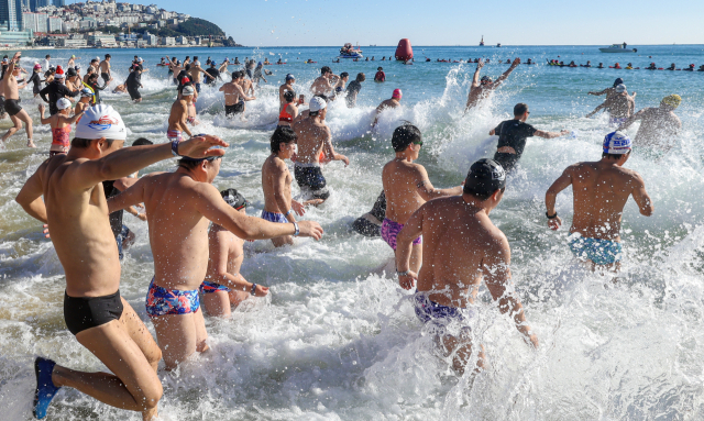 ‘인간 북극곰’이 차가운 해운대 겨울 바다에 뛰어드는 이색 겨울 축제 ‘37회 해운대 북금곰축제’가 8일 부산 해운대해수욕장에서 열렸다. 부산일보 주최로 열린 이날 행사에서 참가자들이 차가운 바닷물에 입수해 겨울바다를 만끽하고 있다. 김종진 기자 kjj1761@
