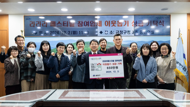 부산 금정구(구청장 윤일현)는 지난 10월에 열린 제8회 라라라 페스티벌 참가 업체들이 이웃돕기 성금 650만 원을 기탁했다고 밝혔다.