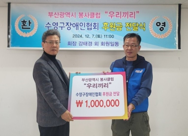 부산 봉사클럽 ‘우리끼리’(회장 강태경)는 지난 7일 연말을 맞아 수영구장애인협회(회장 어용우)에 사회공헌 후원금을 기증했다.