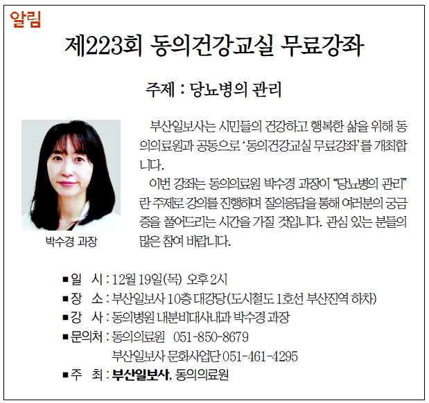 부산일보사는 시민들의 건강하고 행복한 삶을 위해 동의의료원과 공동으로 '동의건강교실 무료강좌'를 개최합니다.