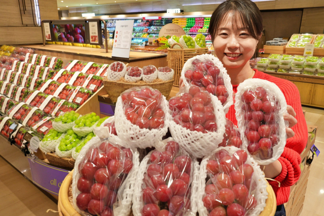 롯데백화점이 오는 22일까지 신품종 적색 포도 ‘글로리 스타’를 판매한다고 9일 밝혔다. 모델이 신품종 적포도 ‘글로리 스타’를 소개하고 있다. 롯데백화점 제공