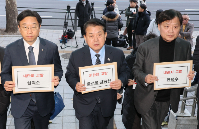 더불어민주당 김병주(가운데) 최고위원과 이용우(왼쪽)·이태형 법률위원장 등이 9일 서울 서대문구 경찰청 국가수사본부 앞에서 윤석열 대통령, 김용현 전 국방부 장관, 한덕수 국무총리 고발 기자회견을 마친 뒤 고발장 접수를 위해 이동하고 있다. 연합뉴스