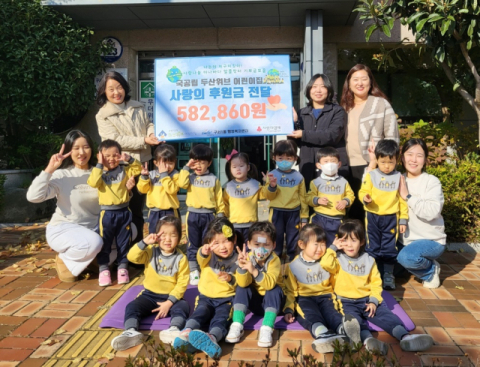 이 성금은 두산위브어린이집에서 연간 특색 활동인 ‘ESG 환경지킴이’ 활동을 추진하고 그 마무리로 지난 21일 실시한 아나바다 알뜰 바자회를 통해 마련한 것이다.
