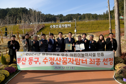 부산 동구(구청장 김진홍)는 대형 숲속 놀이시설인 수정산꿈자람터가 행정안전부 주관 2024년 전국 우수 어린이놀이시설에 선정돼 11일 현판 수여식을 가졌다고 밝혔다.