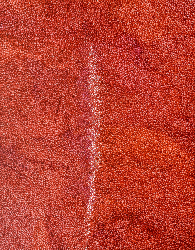 특히 ‘red bean-bird’는 정정엽 작가의 대표적인 작품 소재인 ‘붉은 팥’을 통해 생명력과 함께 자연을 표상하고 있다. 붉은색 유화물감을 세필로 투명하고 맑게 둥굴려 한 알, 한 알 팥을 수만 개 밀도 있게 그렸다. 수만 개 팥이 모이고 흩어지면서 새 형상이 드러난다. 새 형상은 부산현대미술관이 위치한 철새도래지 을숙도라는 지정학적인 특이점과 더불어 미술관에서 지속적으로 선보이는 자연과 환경이라는 주요 의제와도 맞닿아 있다. 한편 강렬하게 쏟아지는 붉은 팥이 그려진 캔버스는 작가가 체화한 노동과 시간의 기록이자, 결실이기도 하다.