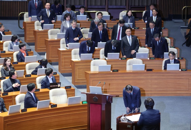 한덕수 국무총리를 비롯한 국무위원들이 11일 오후 국회 본회의에서 진행된 ‘윤석열 대통령 위헌적 비상계엄 선포 내란 행위 관련 긴급현안질문’에서 더불어민주당 서영교 의원의 요구에 따라 일어서서 대국민 사과 인사를 하고 있다. 김문수 고용노동부 장관은 사과를 거부했다. 연합뉴스