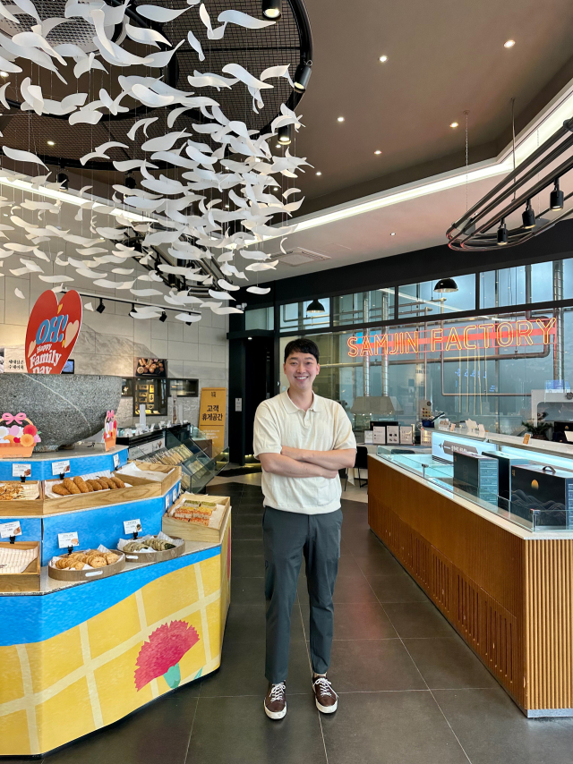부산명품수산물협회장을 맡고 있는 삼진어묵 박용준 대표가 매장 안에서 자사 어묵 베이커리 제품을 보이고 있다. 삼진어묵 제공