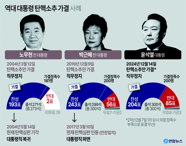 윤석열 대통령이 1987년 민주화 이후 배출한 8명의 대통령 중 노무현·박근혜 전 대통령에 이어 국회의 탄핵소추로 인해 직무가 정지된 세 번째 대통령으로 기록됐다.
