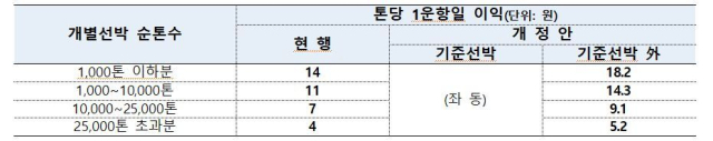 이에 따라 기준선박은 현행과 마찬가지로 1000t 이하 선박은 t(톤)당 14원, 1000~1만t은 11원, 1만~2만 5000t은 7원, 2만 5000t 초과는 4원이 각각 부과된다. 다만, 용선선박의 경우 1000t 이하는 18.2원, 1000~1만t은 14.3원, 1만~2만 5000t은 9.1원, 2만 5000t 초과는 5.2원이 가각 부과된다.