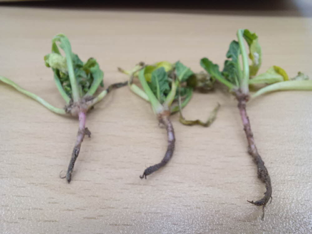 습해를 입은 시금치의 원뿌리 선단과 잔뿌리가 모두 썩었다. 남해군 제공