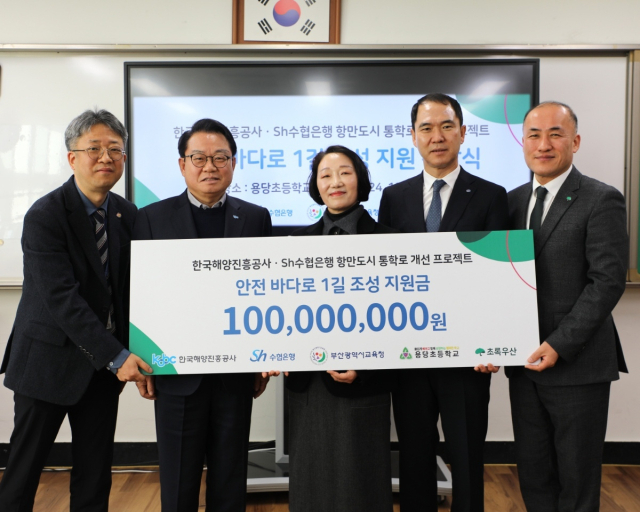 한국해양진흥공사(사장 안병길, 이하 ‘해진공’)와 SH수협은행(은행장 신학기, 이하 ‘수협’)는 16일 부산 용당초등학교에서 ‘어린이 안전 통학로 지원사업’의 후원(각 기관 5000만원, 총 1억 원) 전달식을 가졌다고 밝혔다.
