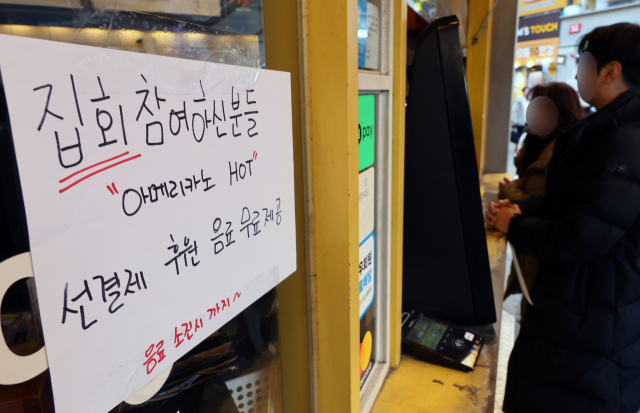 윤석열 대통령에 대한 탄핵소추안 재표결이 실시된 지난 14일 오후 부산 부산진구 서면의 한 카페에 선결제 안내문이 붙어 있다. 연합뉴스