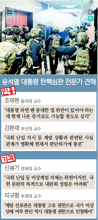 내년 1월부터 31대 한국헌법학회장 임기를 시작하는 조재현 동아대 법학전문대학원 교수는 “두 전직 대통령의 탄핵소추 심판을 보면 대통령을 파면하려면 중대한 법 위반이 있어야 하는데 현재까지만 나온 증거만 봐도 결코 가볍게 볼 수 없다”며 “국회에서 국회의원을 체포하려고 시도한 것이나 중앙선관위에 군대를 보낸 행위 등은 충분히 탄핵까지 가능하다고 판단할 수 있다”고 밝혔다. 이어 “형법상의 위법성 판단과 헌법재판소의 위헌·위법성 판단은 다르다”며 “가장 중요한 것은 계엄 해제 요구 권한이 있는 국회에 대한 무력화 시도 등으로 권한을 침범한 부분으로 충분히 탄핵 사유로 볼 여지가 있다”고 덧붙였다.