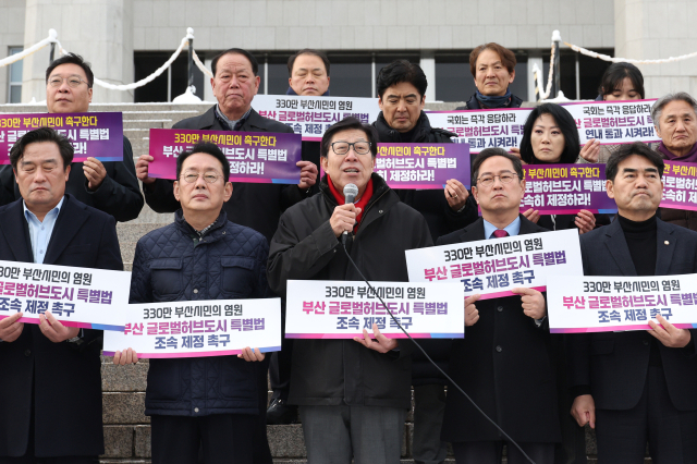 박형준 부산시장이 지난달 27일 국회 본청 앞에서 열린 ‘부산 글로벌 허브도시 특별법 제정 촉구 기자회견’에서 발언을 하고 있다. 연합뉴스