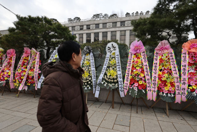 17일 오전 헌법재판소 앞에서 한 시민이 지나가며 화한을 보고 있다. 윤석열 대통령 지지 화환(분홍)과 반대 화환(하양)이 놓여 있다. 연합뉴스