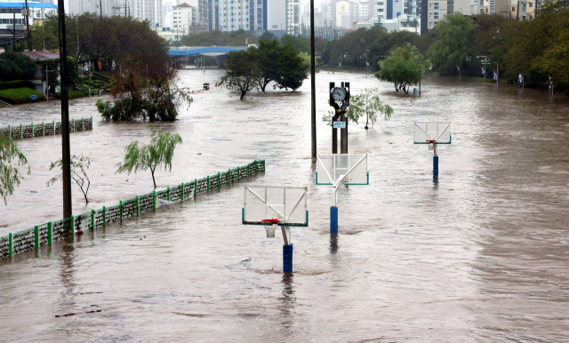 폭염이 절정에 이르렀던 지난 8월 부산 해운대구 벡스코 인근 도로에 열기로 인한 아지랑이가 피어 오르고 있다. 아래는 추석 직후인 지난 9월 21일 부산 곳곳에 200mm가 넘는 폭우가 내려 온천천 체육 시설이 잠긴 모습. 부산일보DB