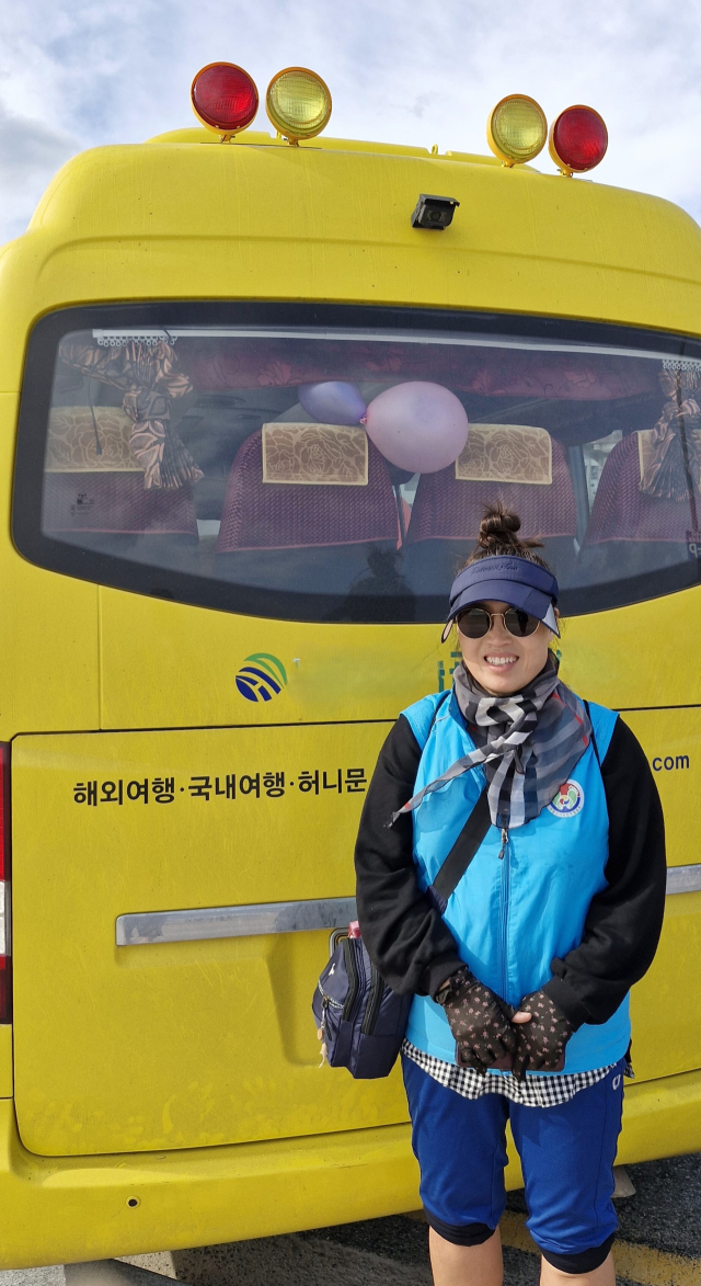 세븐비치 어싱 챌린지 네 번째 이벤트가 열린 11월 9일 부산 송정해수욕장에서 자신이 운행하는 통학버스를 배경으로 포즈를 취한 박은영 씨. 박 씨는 당시 함께 활동하는 맨발걷기 동호회 회원들을 이 버스에 태워 송정으로 달려왔다. 김희돈 기자
