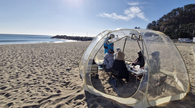 박은영 씨 일행이 지난 14일 오전 부산 임랑해수욕장 백사장에 설치한 간이 텐트 안에 모여 있다. 이들은 간단한 요기를 마친 후 곧바로 바닷가 맨발걷기에 나섰다. 김희돈 기자