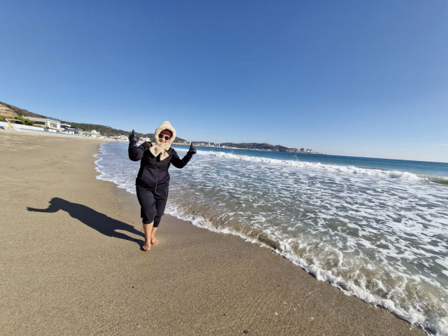 박은영 씨가 지난 14일 부산 기장군 임랑해수욕장에서 맨발걷기를 하고 있다. 경남 김해시에 살고 있는 박 씨는 겨울이면 주말마다 부산의 바닷가를 찾는다고 한다. 김희돈 기자
