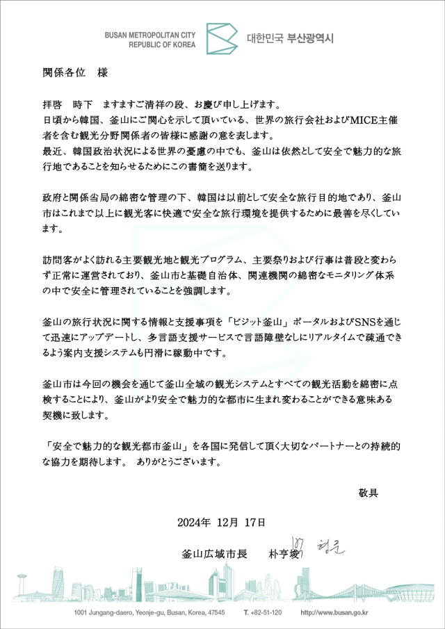 박 시장은 서한을 통해 “방문객들이 자주 찾는 주요 관광지와 주요 축제 및 행사를 포함한 관광 프로그램이 평소와 다름없이 정상적으로 운영되고 있으며, 면밀한 모니터링 하에 안전하게 관리되고 있다”고 강조했다.