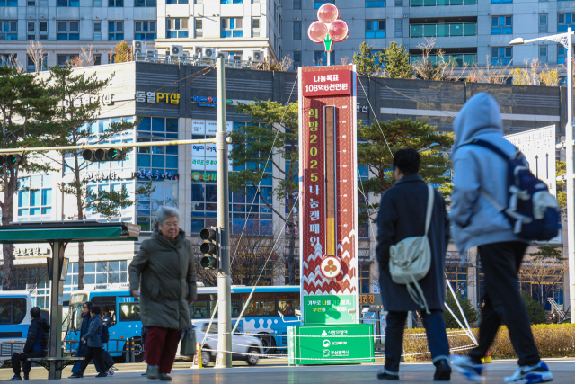 18일 오후 부산 송상현광장에 연말연시 이웃돕기를 위한 사랑의열매 사랑의온도탑이 설치되어 있다. 김종진 기자 kjj1761@