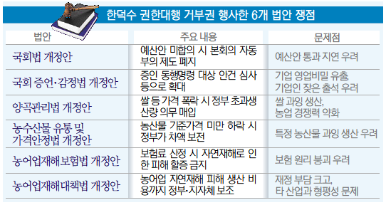 한덕수 대통령 권한대행 국무총리는 19일 야당 단독으로 처리된 6개 쟁점법안들에 대한 재의요구권(거부권)을 행사하면서 이들 법안들이 헌법상 자유시장 경제 원칙을 정면으로 거스르고, 민생 경제에 막대한 부담으로 작용한다고 설명했다. 실제 6개 법안은 지난달 28일 더불어민주당이 국회 본회의에서 단독 처리할 때부터 정부가 거부권을 행사할 것이라는 예상이 지배적이었다.