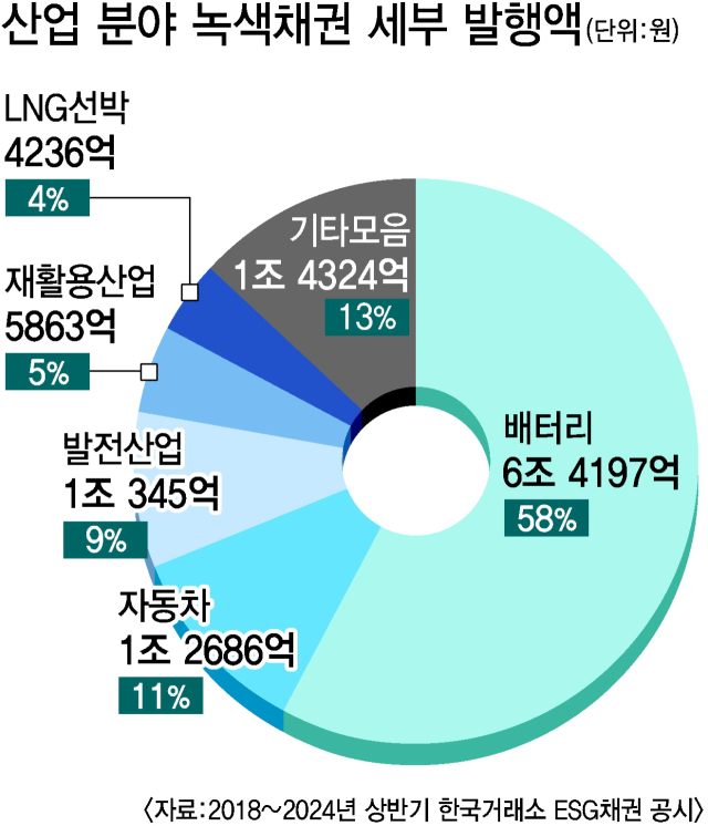제조업 중심의 산업 현장에 직접 투입된 녹색채권은 모두 11조 1651억 원이다. 공장 증설, 연구개발 투자, 부품 구매 등으로 쓰였다. 이 중 6조 4197억 원(58%)이 배터리 관련이다. 이어 1조 2686억 원(11%)이 친환경 자동차 관련 시설 투자·연구개발·부품 제작 등에 쓰였다. 배터리 역시 대부분 전기차 공급용으로 쓰이므로, 사실상 산업 부문에 쓰인 녹색채권의 70% 정도가 친환경 자동차에 투자된 셈이다.