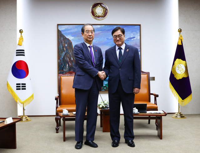 한덕수 대통령 권한대행 국무총리와 우원식 국회의장이 15일 국회 의장실에서 악수하고 있다. 대통령실통신사진기자단