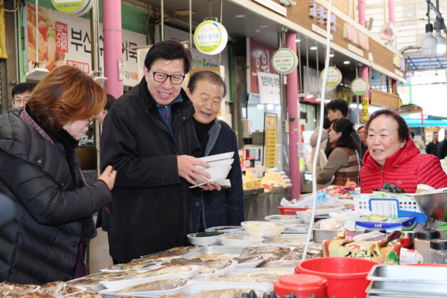 19일 부산 영도구 남항시장에서 박형준 시장과 양재생 부산상공회의소 회장 등이 물품을 구매하면서 '착한결제 캠페인'을 하고 있다. 연합뉴스