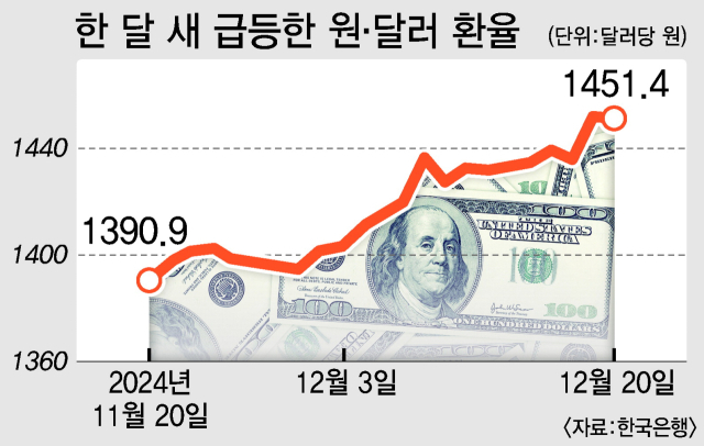탄핵 정국 등 국내 요인과 트럼프 신행정부 출범 등 외부 요인을 고려하면, 앞으로도 환율은 당분간 1450원 부근에 머물며 경우에 따라선 1500원에 이를 수 있을 것으로 전망도 나온다.