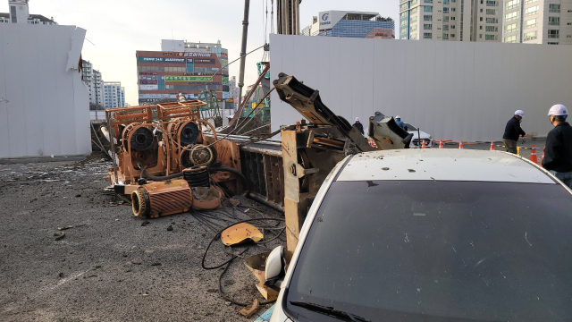 지난 20일 부산 강서구 한 공사장에서 80t짜리 항타기가 인근 주차장으로 쓰러졌다. 독자 제공